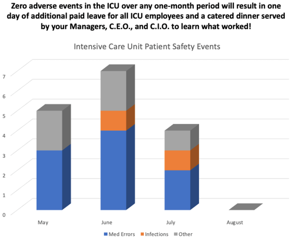 “Leadership wants to provide excellent patient and employee care, so zero adverse events in the ICU over any one-month period will result in one day of additional paid leave for all ICU employees and a catered dinner served by your Managers, C.E.O., and C.I.O. to learn what worked. If the goal is not achieved in 60 days, an executive leadership team member will attend ICU staff team meetings with team leaders to discuss areas in need of improvement until the goal is achieved. Team members voted most responsible for improvements in patient care will be interviewed and presented with additional career development opportunities.”
