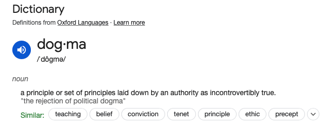 Dogma is something you know is absolutely true. It may seem harmless at first. It comforts you. Why would it disturb others? But it often does disturbs others because a belief that helps you may hurt someone else.