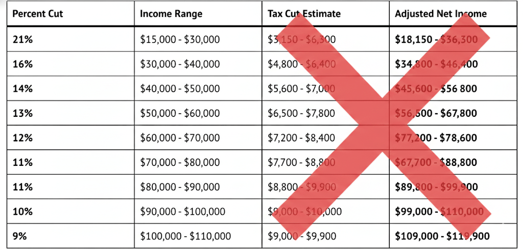 - Used for: The specific percentage cuts (23% for $15k–$30k earners, etc.) and the “take-home pay” projections.